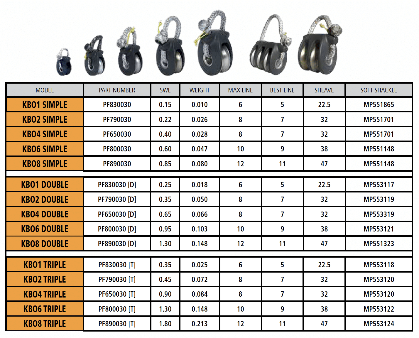 - The rope shackle is included with the block up to KBO30.