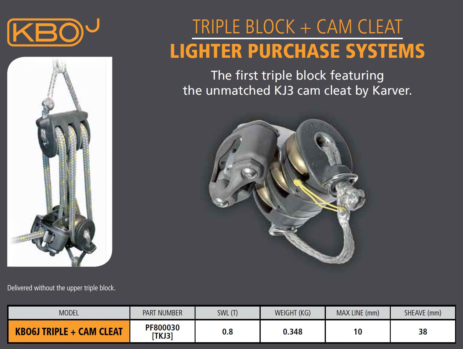 The first triple block featuring the unmatched KJ3 cam cleat by Karver.Delivered without the upper triple block.